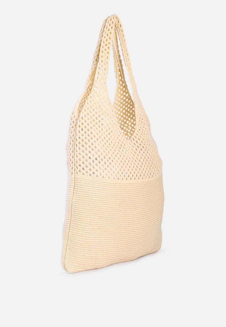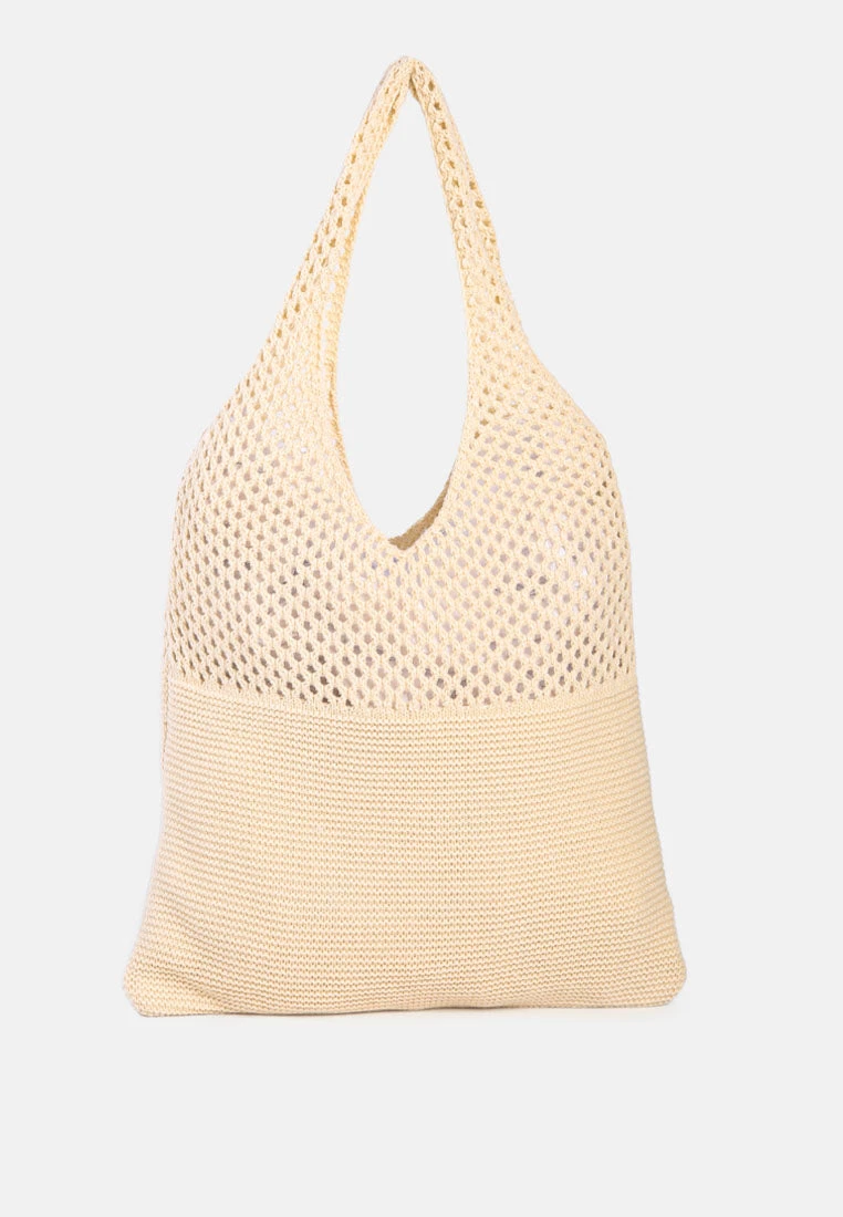Knitted from wool, this knitted bag has enough room for your supplies as you stroll around. It is available in three earthy colors to choose from.