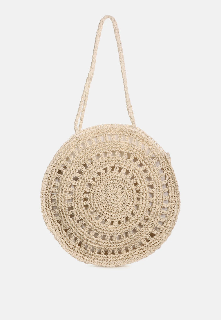 Handmade crochet round bag with a long handle. Made au natural with Paper Yarn, this bag will make to the Beach – Boho look too!